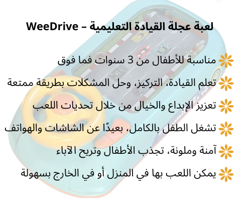عجلة القيادة التفاعلية هي لعبة تعليمية مصممة للأطفال من عمر 3 سنوات، تجمع بين المرح والتعلم في تجربة آمنة ومسلية. من خلال تدوير العجلة، يواجه الطفل تحديات ممتعة، ويطوّر مهاراته في التركيز، الإبداع، وحل المشكلات، بعيدًا عن الهواتف والشاشات. اللعب بهذه اللعبة لا يسبب الإزعاج، بل يمنح الطفل استقلالية ومتعة حقيقية، ويمنح الأهل لحظات من الهدوء والاطمئنان. منتج مثالي لكل من يبحث عن وسيلة تعليمية ترفيهية تنمّي قدرات الطفل وتشغله بشيء يستحق